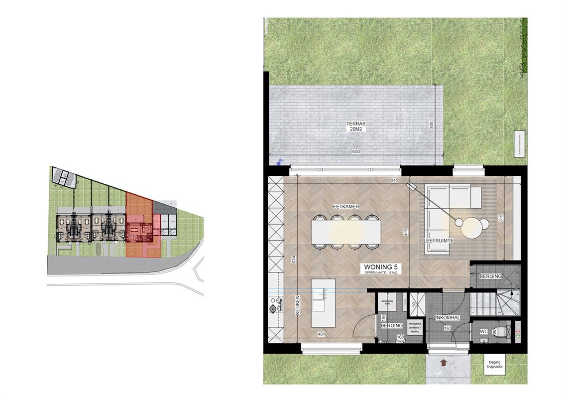 De laatste woning is op het gelijkvloers voorzien als één grote mooie open ruimte, door de koper gemakkelijk te definiëren als leef- of eetruimte.